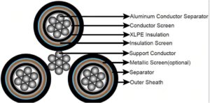 AssemblyThree XLPE insulated screened cores are bundled around the galvanized steel wires in a right hand lay.