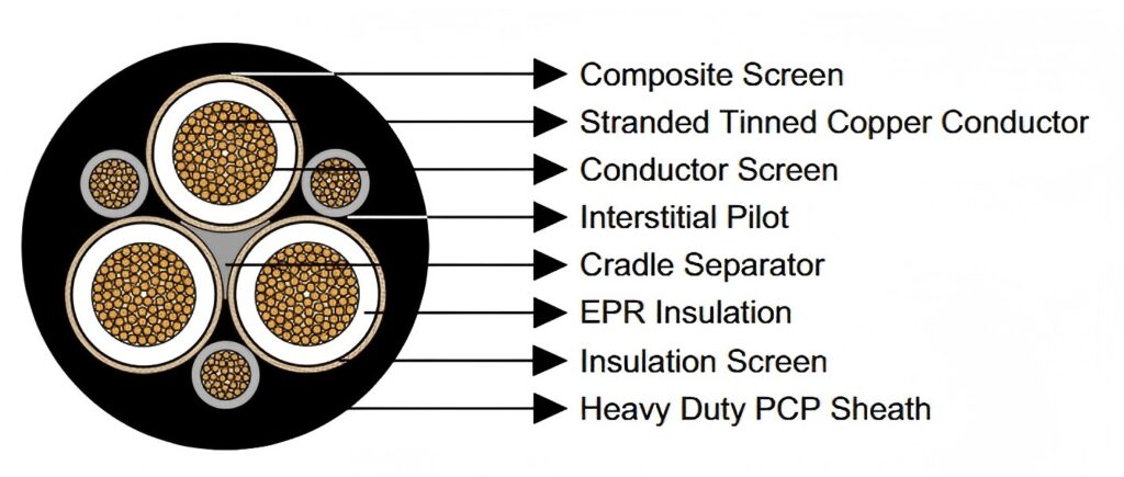 3xInterstitial Pilot: EPR covered flexible stranded tinned copper conductor.