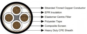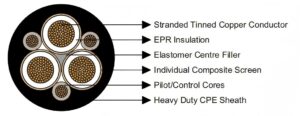 Pilot/Control Cores: EPR covered and composite screened flexible stranded tinned copper conductor.